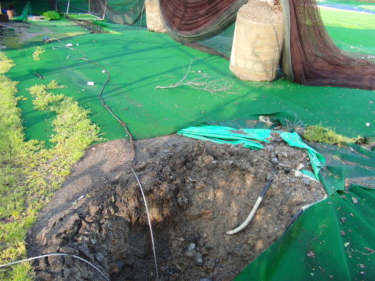 | ワイヤーがズタズタに切れています。 | 竜巻で舞い上がった土砂がフェアウェイ中央に着地しています。 | |