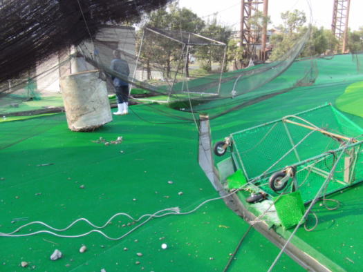 | ワイヤーがズタズタに切れています。 | 竜巻で舞い上がった土砂がフェアウェイ中央に着地しています。 | |