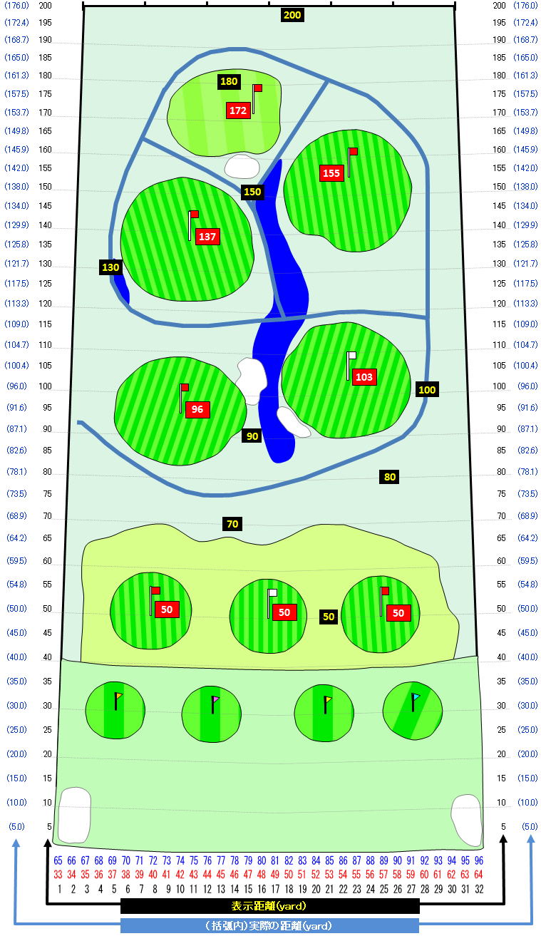 そのため当ゴルフ練習場においては、その分を考慮し、距離表示板は実際の距離よりも短い位置に設置しています。